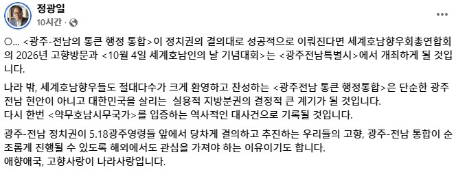 정광일 세계호남향우회총연합회 사무총장은 12일 자신의 SNS를 통해 "광주·전남 통 큰 행정통합이 정치권의 결의대로 성공적으로 이뤄진다면 세계호남향우회총연합회의 2026년 고향방문과 '10월 4일 세계호남인의 날 기념대회'는 '광주전남특별시'에서 개최될 것"이라고 밝혔습니다.