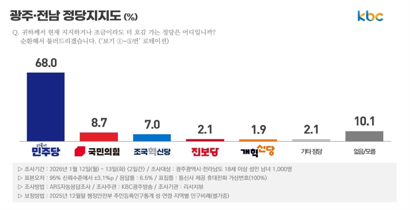 광주·전남 정당지지도는 민주당이 68%로 1위를 차지하며 다른 정당과 큰 격차를 보였습니다.