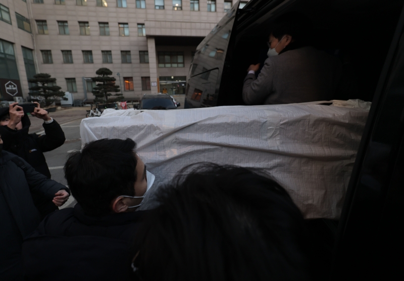 압수수색 당시 수사관들이 흰 천에 싸인 큰 물체를 갖고 나오는 모습이 포착되기도 했습니다.