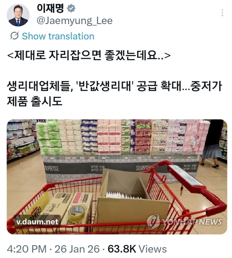 이재명 대통령은 26일 생활용품 업계가 '반값 생리대' 제품 공급을 확대하고 있다는 내용의 보도와 관련해 이 같은 흐름이 안착하길 바란다는 뜻을 밝혔습니다.