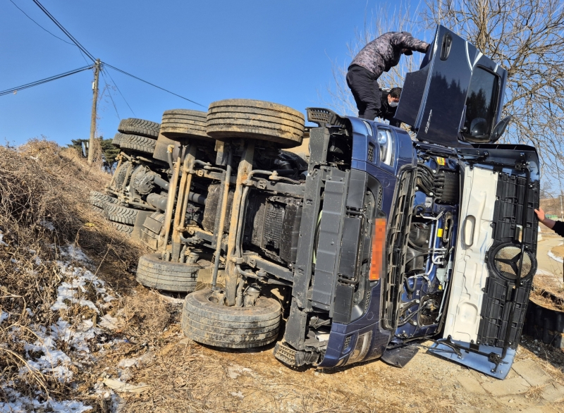 비탈길서 덤프트럭 넘어져…운전자 중태