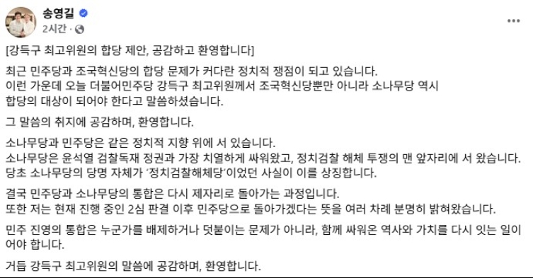 그는 "최근 민주당과 조국혁신당의 합당 문제가 커다란 정치적 쟁점이 되고 있다"며 "이런 가운데 오늘 강득구 최고위원께서 조국혁신당뿐만 아니라 소나무당 역시 합당의 대상이 되어야 한다고 말씀하셨다"라고 적었습니다.