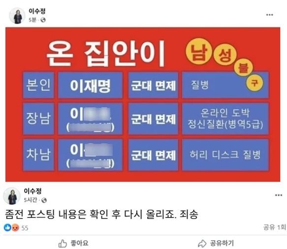 이 당협위원장은 대선을 앞둔 지난해 5월 28일 자신의 페이스북에 "이 후보와 두 아들이 모두 군대 면제를 받았다"는 내용의 글을 올렸다가 더불어민주당의 고발로 재판에 넘겨졌습니다.