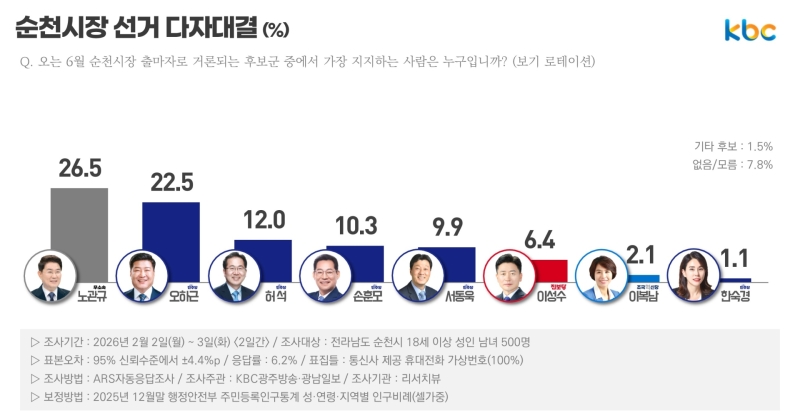 KBC광주방송이 여론조사 기관 리서치뷰에 의뢰해 지난 2~3일 순천시 거주 만 18세 이상 500명을 대상으로 조사한 결과, 다자 대결 지지도는 노관규 순천시장 26.5%, 오하근 전 순천시장 후보 22.5%로 오차범위(±4.4%p) 내로 집계됐습니다.