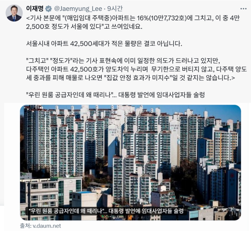 이 대통령은 이날 엑스(X·옛 트위터)에 '임대주택 제도를 도마 위에 올린 이 대통령의 발언에 임대사업자들이 술렁이고 있다'는 내용의 언론 기사를 첨부하며 이같이 말했습니다.