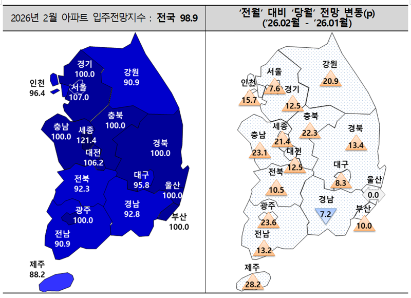 광주를 비롯해 대전(106.2, 12.5p↑), 부산(100.0, 10.0p↑), 대구(95.8, 8.3p↑), 세종(121.4, 21.4p↑)이 올랐습니다.
