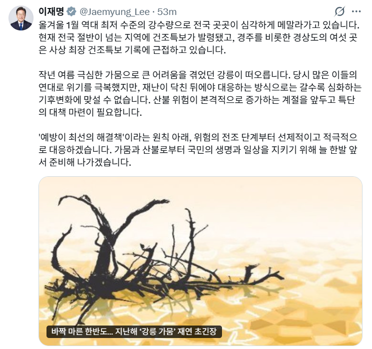 이 대통령은 10일 자신의 SNS를 통해 "올겨울 1월 역대 최저 수준의 강수량으로 전국 곳곳이 심각하게 메말라가고 있다"며 기후 변화로 인해 심화하는 가뭄과 산불 위험에 대한 우려를 표명했습니다.