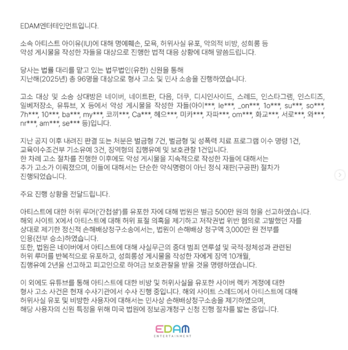 소속사에 따르면 지난해(2025년) 법무법인(유한) 신원을 통해 총 96명을 대상으로 형사 고소와 민사 소송을 제기했습니다.