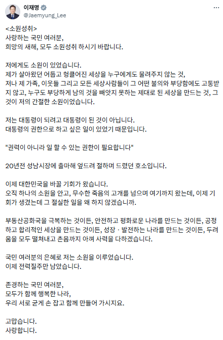 이 대통령은 "존경하는 국민 여러분, 서로 굳게 손잡고 모두가 함께 행복한 나라를 함께 만들어 가시지요. 고맙습니다. 사랑합니다"라고 글을 맺었습니다.