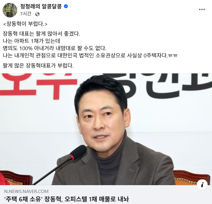이어 "나는 개인적 관점으로, 대한민국 법적인 소유권상 사실상 0주택자"라며 "팔 게 많은 장 대표가 부럽다"고 꼬집었습니다.