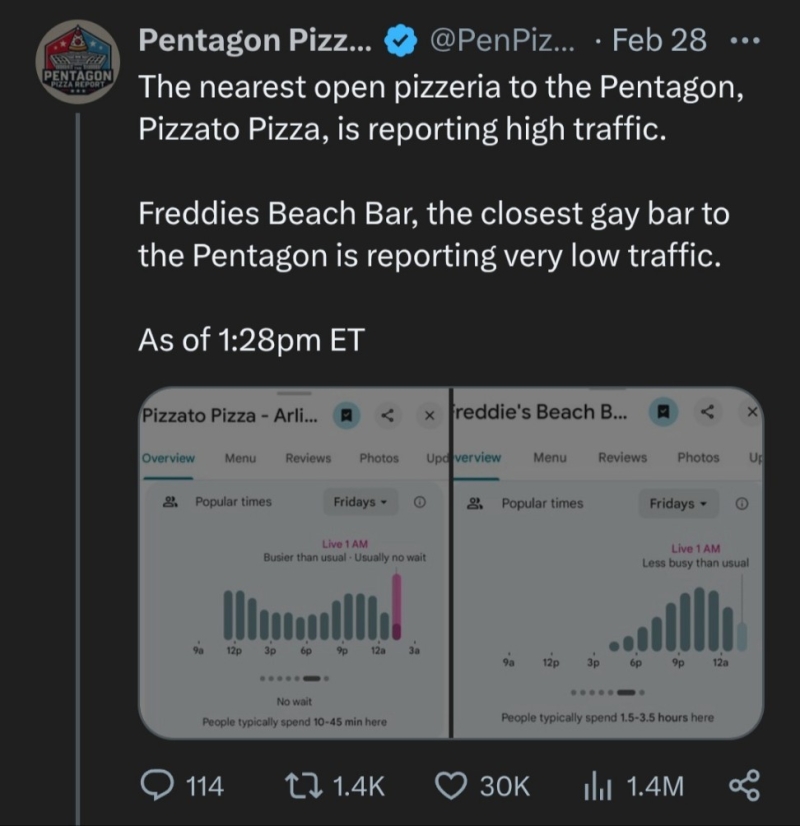 2024년 8월에 활성화된 이 계정은 구글 지도의 '인기 시간대' 기능을 활용해 국방부 주변 피자 가게가 평소보다 바쁜지 추적합니다.