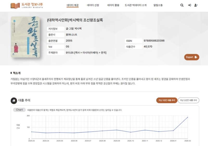 단종실록과 세조실록을 다룬 역사 만화 '박시백의 조선왕조실록 5'(2005·휴머니스트) 역시 영화 개봉을 전후해 월별 대출 건수가 70건에서 186건으로 배 이상 늘었습니다.