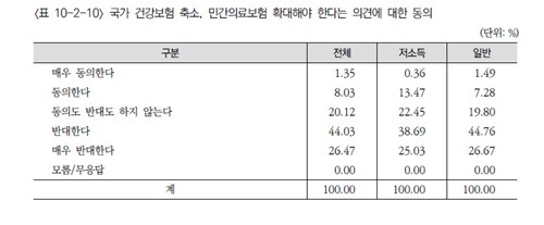 '국가 건강보험을 축소하고 민간 의료보험을 확대해야 한다'는 의견에는 70.50%가 반대했고, 찬성은 9.38%에 그쳤습니다.