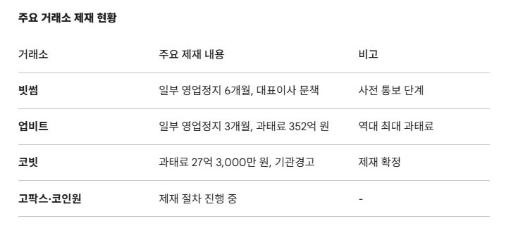 코빗은 과태료 27억 3,000만 원과 기관경고를, 고팍스와 코인원도 제재 절차를 밟고 있습니다.