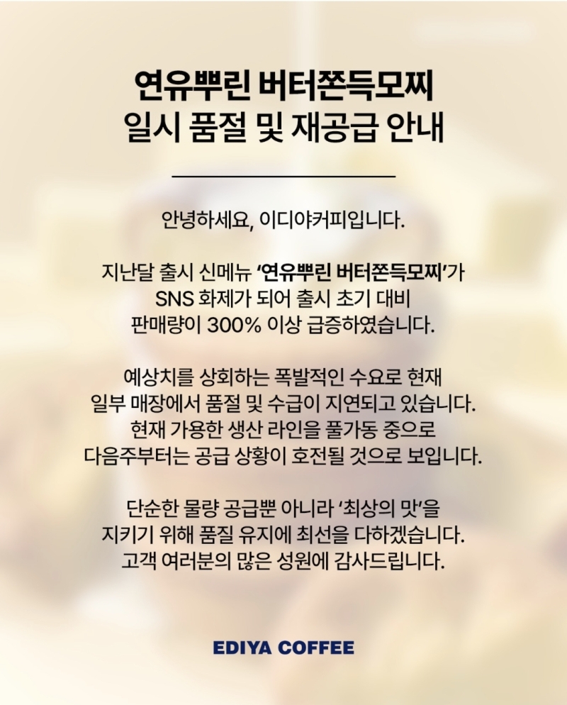 이디야커피도 지난달 말부터 '연유뿌린 버터쫀득모찌'를 판매하고 있습니다. 가격은 1개 2,500원입니다.