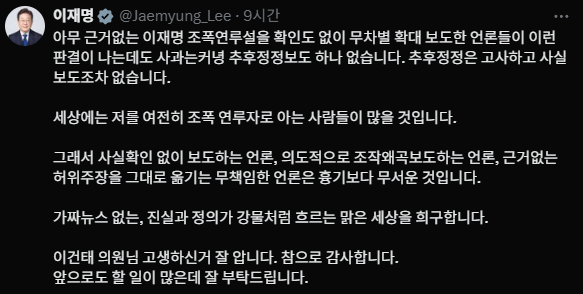 이 대통령은 "아무 근거 없는 '이재명 조폭연루설'을 확인도 없이 무차별 확대 보도한 언론들이 이런 판결이 나는데도 사과는커녕 추후 정정보도 하나 없다"며 "추후 정정은 고사하고 사실 보도조차 없다"고 지적했습니다.