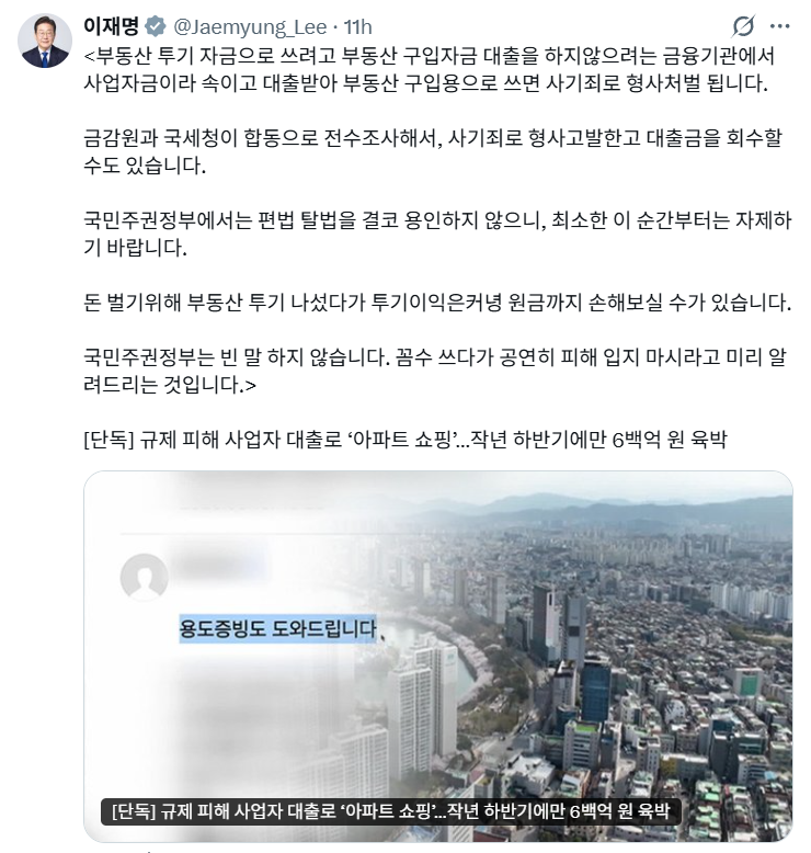 이재명 대통령이 자신의 X(구 트위터) 계정에 사업자 대출 유용 실태를 다룬 언론 보도를 공유하며 용도 외 유용 행위에 대한 엄정 대응 방침을 밝혔습니다.