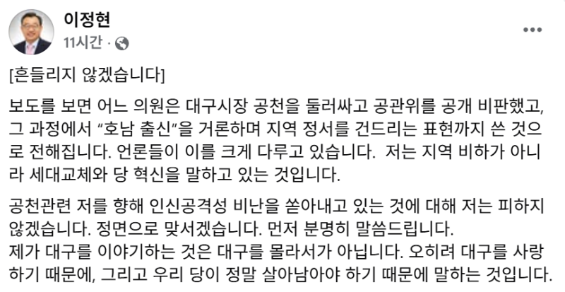 혁신과 세대교체를 말할 때마다 '호남 출신'을 거론하며 지역감정을 자극하는 행태는 대구를 위한 것이 아니라 기득권을 지키기 위해 미래를 가로막는 행위라고 규정했습니다.