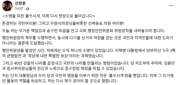 신 의원은 24일 자신의 SNS에 "엄중한 행안위원장 책무를 수행하며 동시에 다가올 선거의 여정을 걷는 것은 국민과 지역민, 동료 의원들에 대한 도리가 아니다"라며 위원장직을 내려놓겠다고 적었습니다.