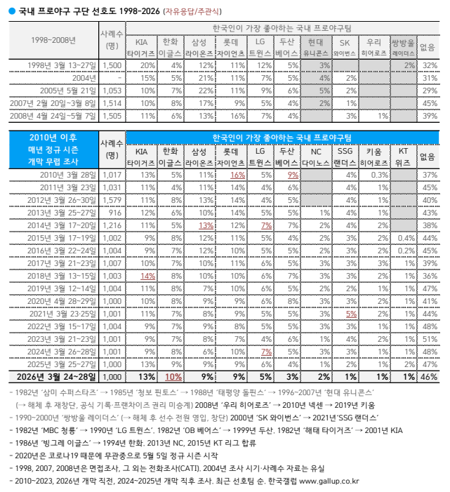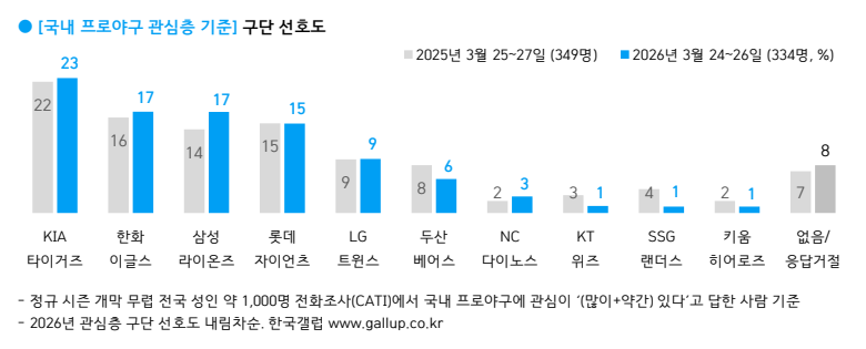 한국갤럽은 지난 2010년부터 매년 프로야구 정규시즌 개막 초기 같은 조사를 실시해 왔는데 이번 조사는 지난 3월 24~26일, 전국 만 18세 이상 1,000명 대상 전화조사원 인터뷰로 진행됐습니다.