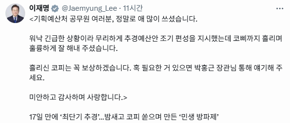 이재명 대통령이 1일 자신의 사회관계서비스 X를 통해 중동 전쟁 여파에 따른 긴급 추경예산안을 17일 만에 편성한 기획예산처 공무원들에게 파격적인 격려 메시지를 보냈습니다.