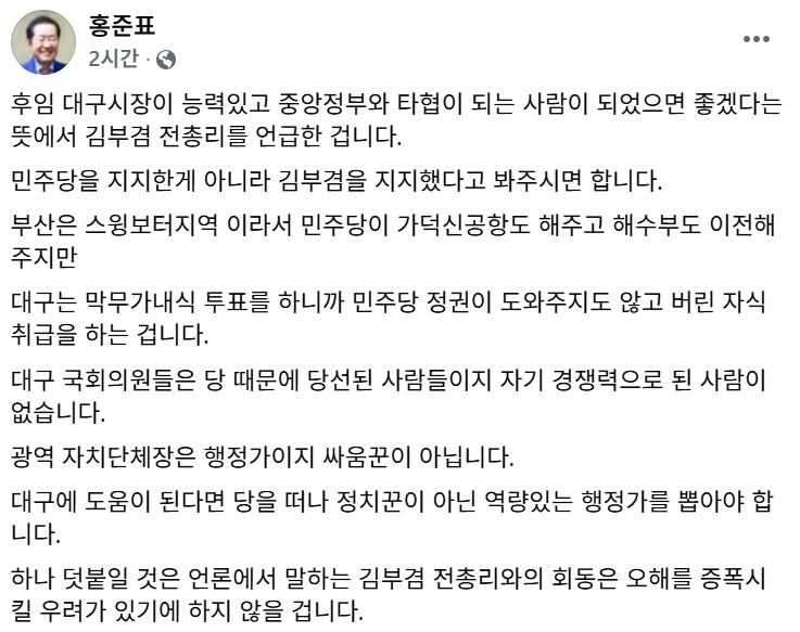 홍준표 전 대구시장은 2일 자신의 SNS를 통해 대구시장 선거에서 김부겸 전 총리를 지지한다는 의사를 공식화했습니다.