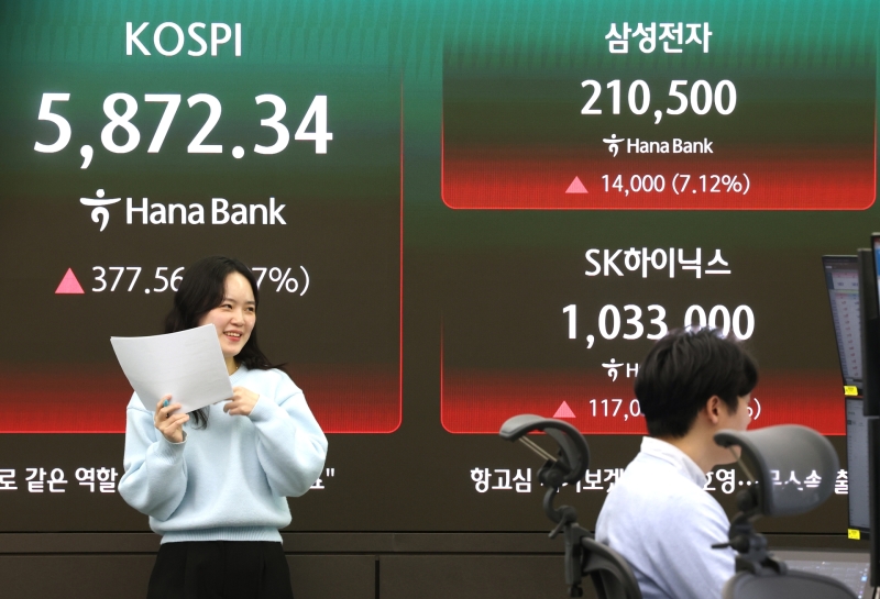 8일 코스피 지수는 전날보다 377.56포인트(6.87%) 급등한 5,872.34로 마감하며 5,900선에 바짝 다가섰습니다.