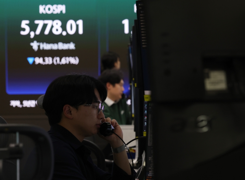 9일 코스피 지수는 전날보다 94.33포인트(1.61%) 하락한 5,778.01로 마감하며 5,770선 대로 내려앉았습니다.