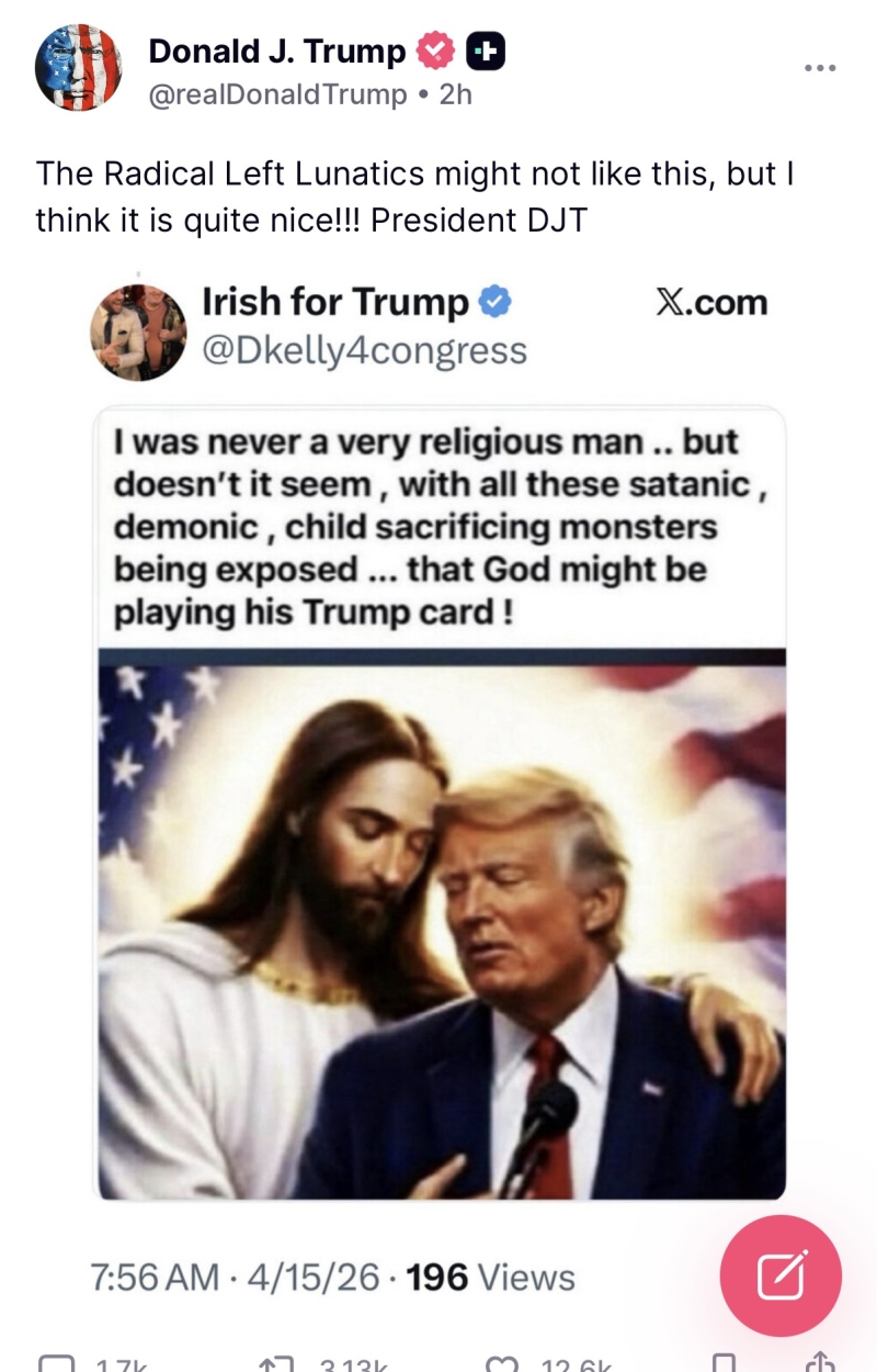 앞서 트럼프 대통령은 지난 12일 흰옷을 입고 붉은 망토를 걸친 채 병든 누군가의 이마에 손을 얹은 자신의 이미지를 올렸습니다.