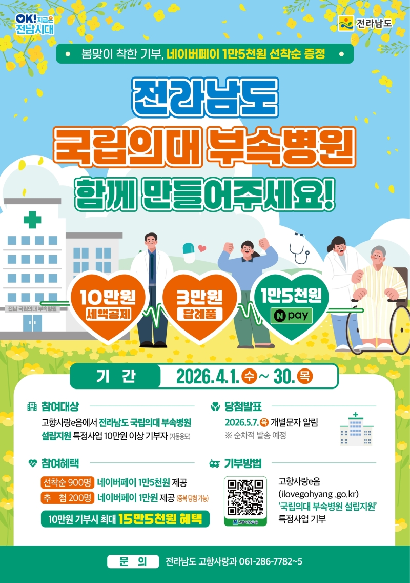 전남도는 30일까지 '국립의대 부속병원 설립 지원' 지정기부 사업을 대상으로 고향사랑기부제 봄맞이 이벤트를 실시합니다.