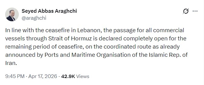 아라그치 장관은 이날 자신의 엑스(X) 계정에 "레바논 휴전 상황을 반영해 남은 휴전 기간 호르무즈 해협을 통과하는 모든 상선의 항해를 전면 허용한다"고 선언했습니다.