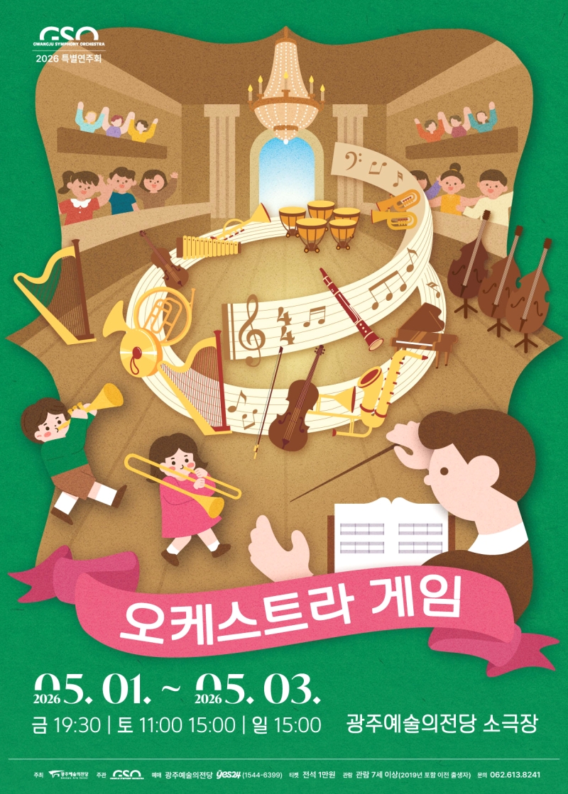 광주시향이 5월 가정의 달을 맞아 오케스트라를 주제로 기획한 키즈콘서트 '오케스트라 게임'은 광주시향의 연주와 지휘 김영언, 나레이션 나웅준이 함께 합니다.
