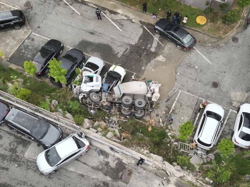 '브레이크 고장' 레미콘, 담벼락 충돌 후 5m 옹벽 아래로 추락…차량 8대 파손