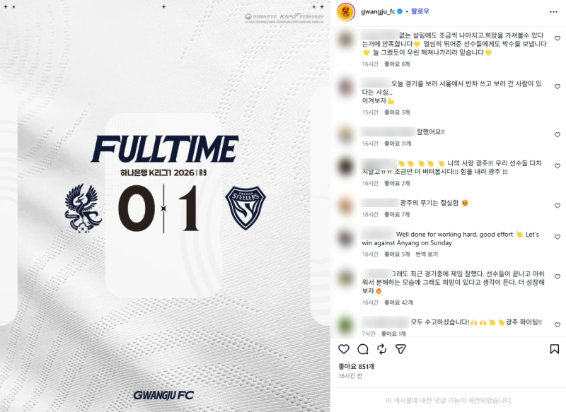 패배 직후 광주FC 공식 SNS에는 오히려 응원의 목소리가 쏟아졌습니다.
