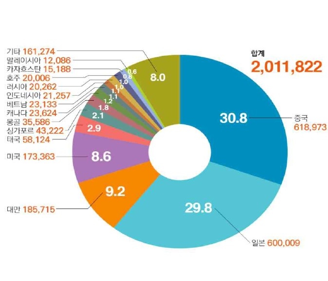지난해 한국을 찾은 외국인 환자 가운데 중국 국적 환자는 61만 8,973명으로 전체의 30.8%를 차지했고, 일본은 60만 9명으로 29.8%, 대만은 18만 5,715명으로 9.2%를 기록했습니다.