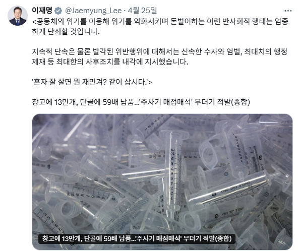 이재명 대통령도 지난 25일 엑스(X·옛 트위터)에 주사기 매점매석 관련 기사를 공유하며 "지속적 단속은 물론 발각된 위반 행위에 대해서는 신속한 수사와 엄벌, 최대치의 행정제재 등 최대한의 사후 조치를 내각에 지시했다"고 강조했습니다.