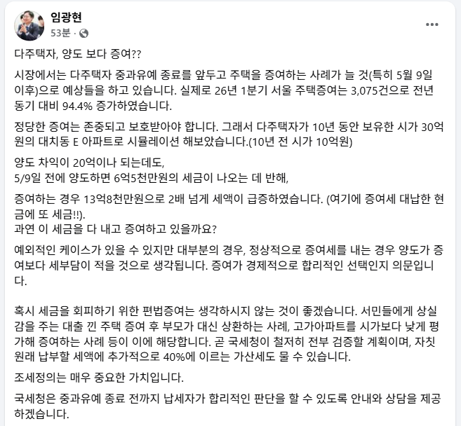 임 청장은 29일 자신의 SNS(페이스북·X)에서 "혹시 세금을 회피하기 위한 편법증여는 생각하지 않는 것이 좋겠다"며 이같이 강조했습니다.