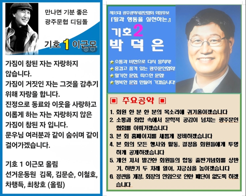제15대 광주광역시문인협회 회장 선거가 이근모·박덕은 시인 2파전으로 전개되고 있는 가운데 지방선거를 방불케 할 정도로 뜨거운 열기를 내뿜고 있습니다.