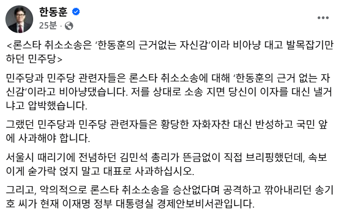 또 다른 게시글에서도 "민주당과 민주당 관련자들은 론스타 취소소송에 대해 '한동훈의 근거 없는 자신감'이라고 비아냥댔다"고 지적했습니다.