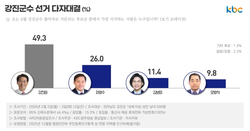 KBC 광주방송이 여론조사 전문기관 리서치뷰에 의뢰해 지난 2~3일 이틀간 강진군민 500명을 대상으로 지지 후보를 조사한 결과, △강진원 현 강진군수(49.3%) △차영수 현 전남도의원(26.0%) △김보미 전 강진군의회 의장(11.4%) △오병석 전 농림축산식품부 차관보(9.8%) 순으로 나타났습니다.