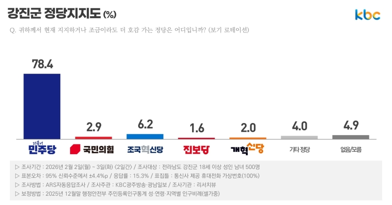 강진군 정당지지도는 △더불어민주당(78.4%) △조국혁신당(6.2%) △국민의힘(2.9%) △개혁신당(2.0%) △진보당(1.6%) 등으로, 지역 내 민주당에 대한 지지도가 압도적인 상황입니다.