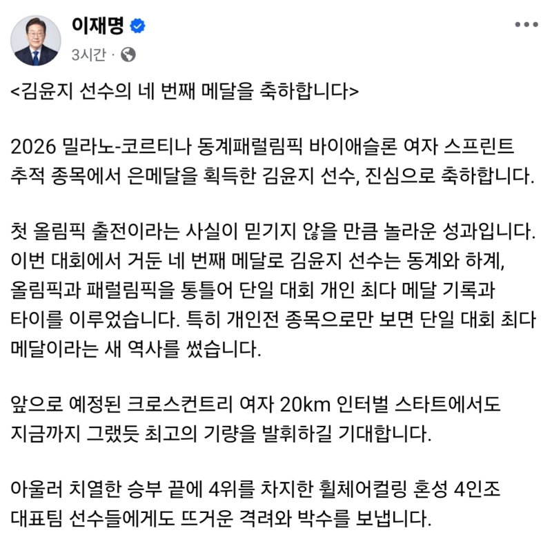 이재명 대통령이 2026 밀라노·코르티나담페초 동계패럴림픽에서 네 개의 메달을 수확한 김윤지를 향해 "'개인전 단일 대회 최다 메달'의 새 역사를 썼다"고 축하했습니다.