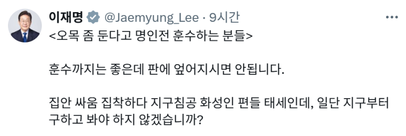 이 대통령은 14일 엑스(X·옛 트위터)에 올린 글에서 "오목 좀 둔다고 (바둑) 명인전에 훈수하는 분들, 훈수까지는 좋은데 판에 엎어지시면 안 된다"고 밝혔습니다.
